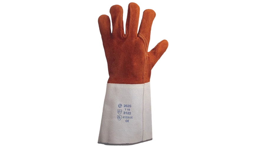 - 1,2 mm-es vastag, tűzálló anyaggal kezelt, hő- és lángálló marhahasíték hegesztőkesztyű