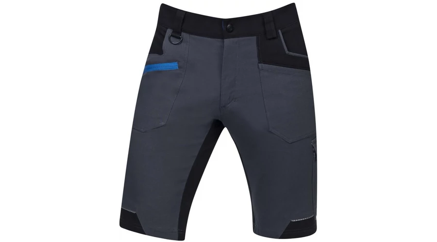 • A rövidnadrág D-gyűrűvel van felszerelve karabinerhez, 2 mély kézzsebbel, 1 elülső cipzáras zsebbel és 1 széles hurokkal ellátott elülső szerszámos zsebbel.