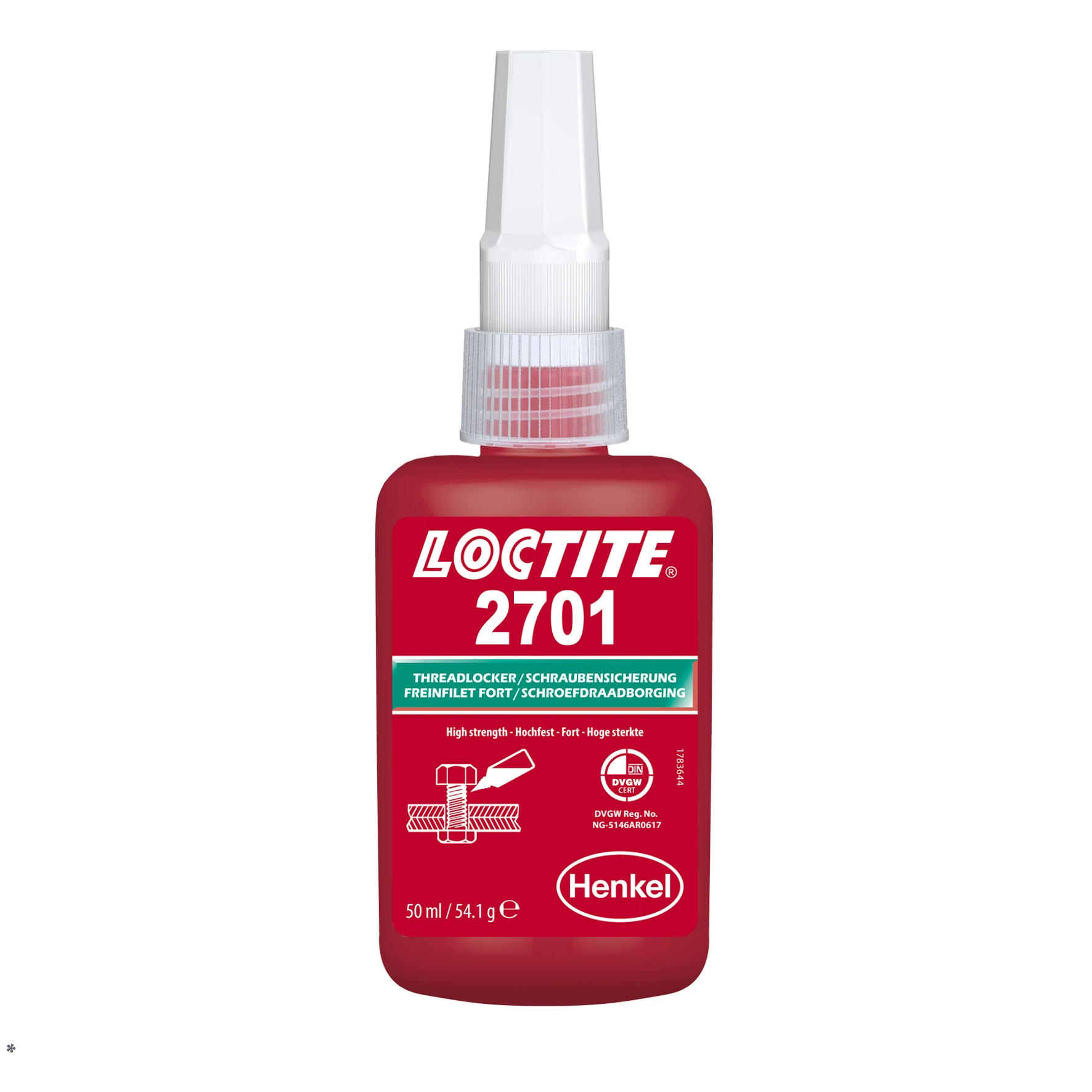 A LOCTITE 2701 nagy szilárdságú, kis viszkozitású, zöld színű, metakrilát bázisú csavarrögzítő termék. Kiváló krómozott felületekre. Jellemző rögzítési idők 10, 4 és 25 perc acélon, sárgarézen és rozsdamentes acélon. Ipari olajokkal enyhén szennyezett felületeken is alkalmazható. UV fénnyel megvilágítva fluoreszkál.