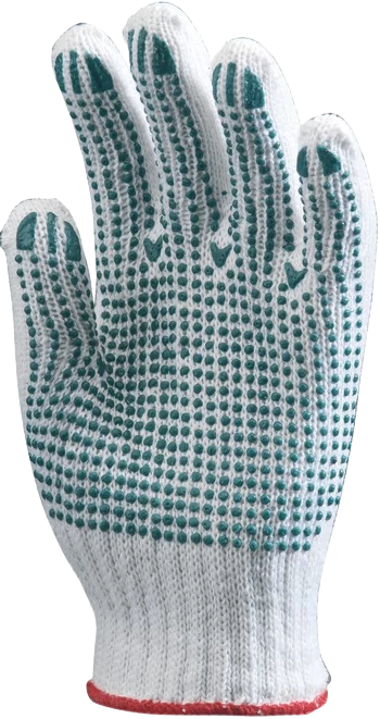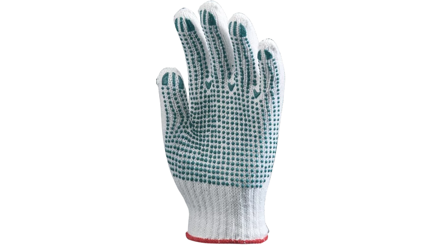 Pamut/Poliészter alapanyagú cérnakesztyű. PVC pöttyözéssel/pontozással a tenyéren ezáltal csúszásbiztos fogást biztosít.